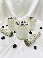 This handmade large Crystal Cleanse Sage Candle is made up of High Vibrational Positive Cleansing Energy, Pure Essential Oils and most importantly Tourmaline and Clear Quartz Crystals added and infused into the candle to help clear and protect your energy whether you are in your room, home or office. You will feel the change in your vibration, heal the mind, body and spirit. We hope you enjoy the Crystal Cleanse Experience.