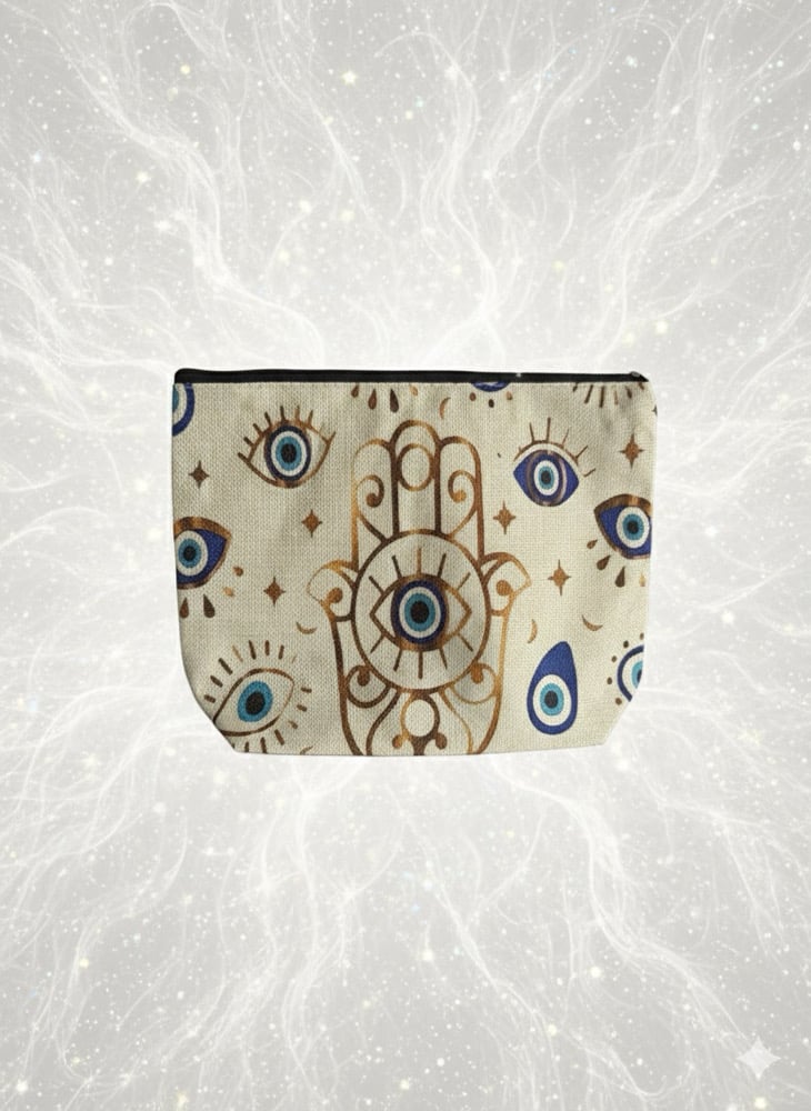 Carry your energy safely and in style with this beautifully designed Evil Eye Protection Pouch. Featuring the powerful symbols of the Hamsa Hand and Evil Eye, this pouch serves as your daily talisman against negativity and unwanted energies.